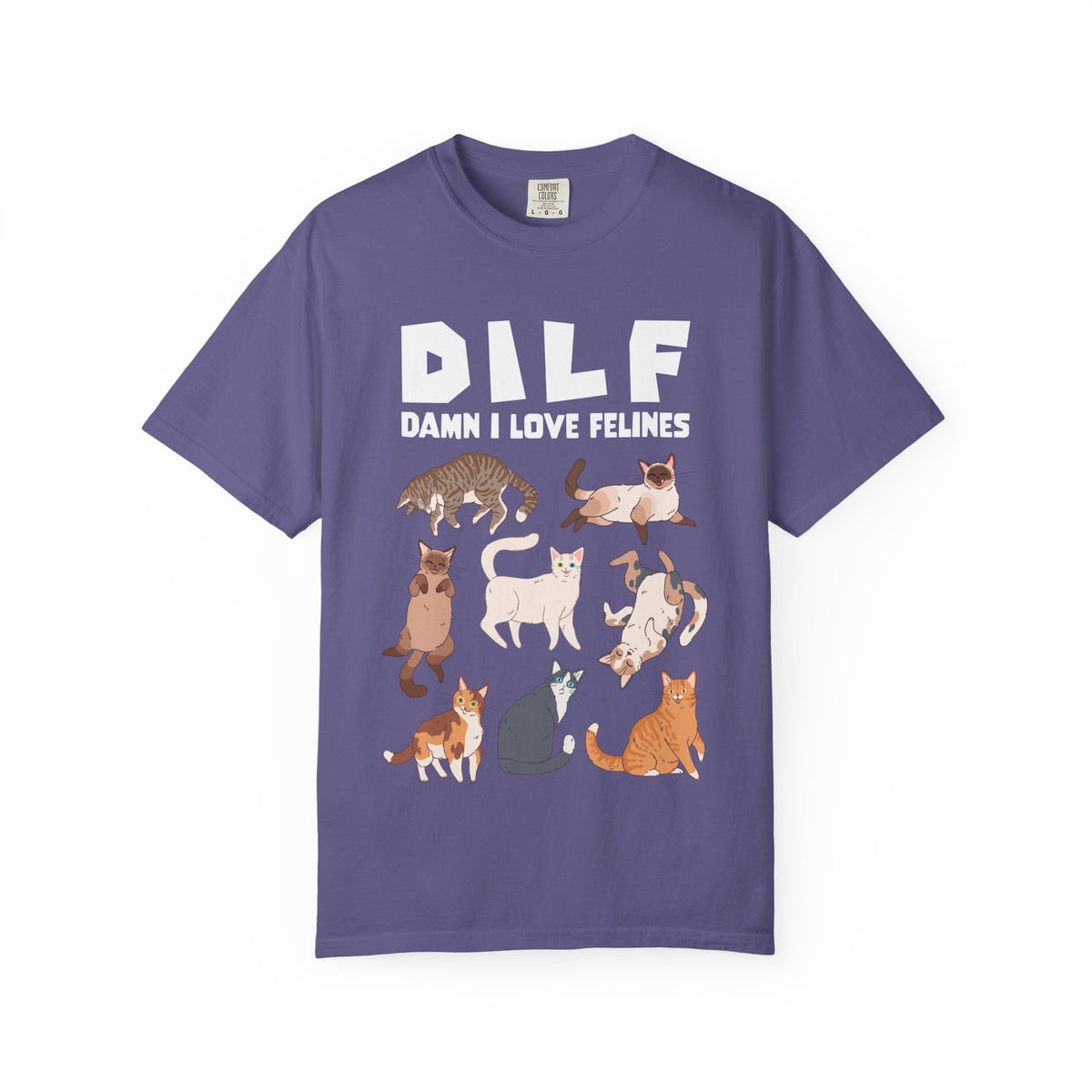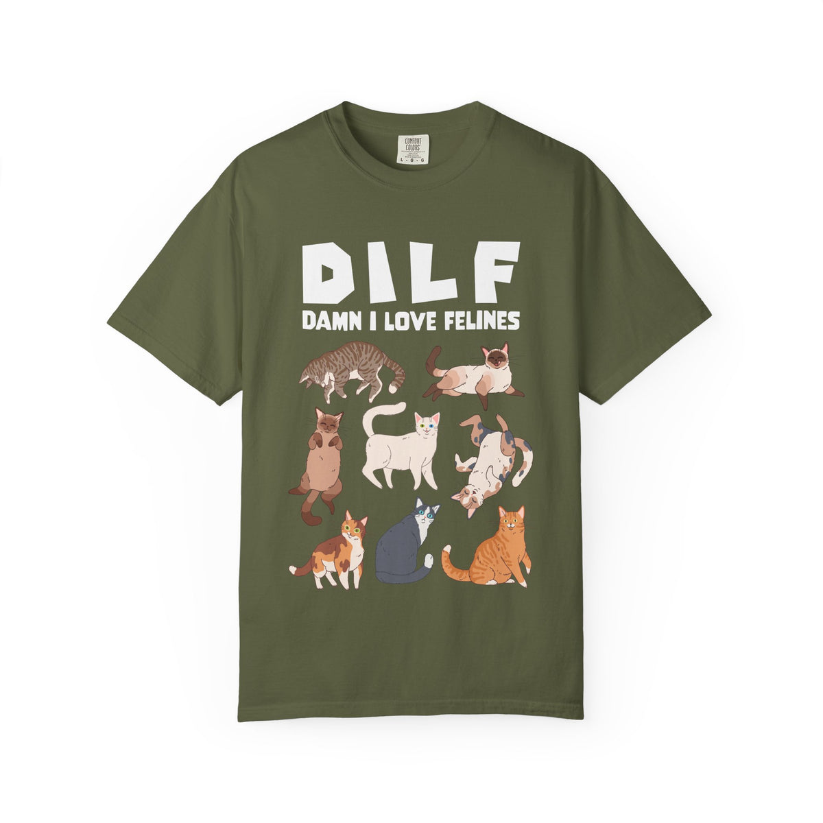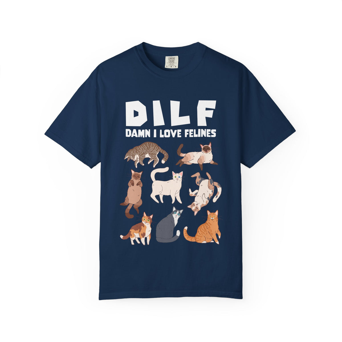 Embrace your devotion to cats and your sense of humor with the hilarious "DILF Damn I Love Felines" T-Shirt! This graphic tee brilliantly reclaims the provocative DILF acronym (Dad I'd Like to F***) and repurposes it to celebrate the true love of many—a passionate dedication to cats! Featuring a collage of various adorable felines, this shirt is the ultimate piece of sarcastic and wholesome pet lover apparel.