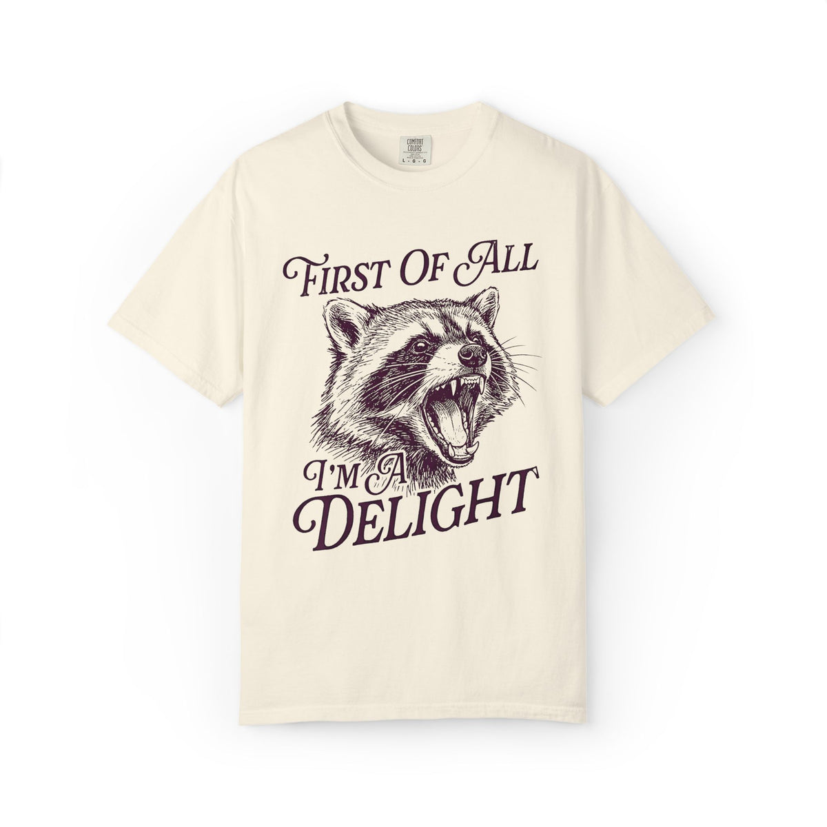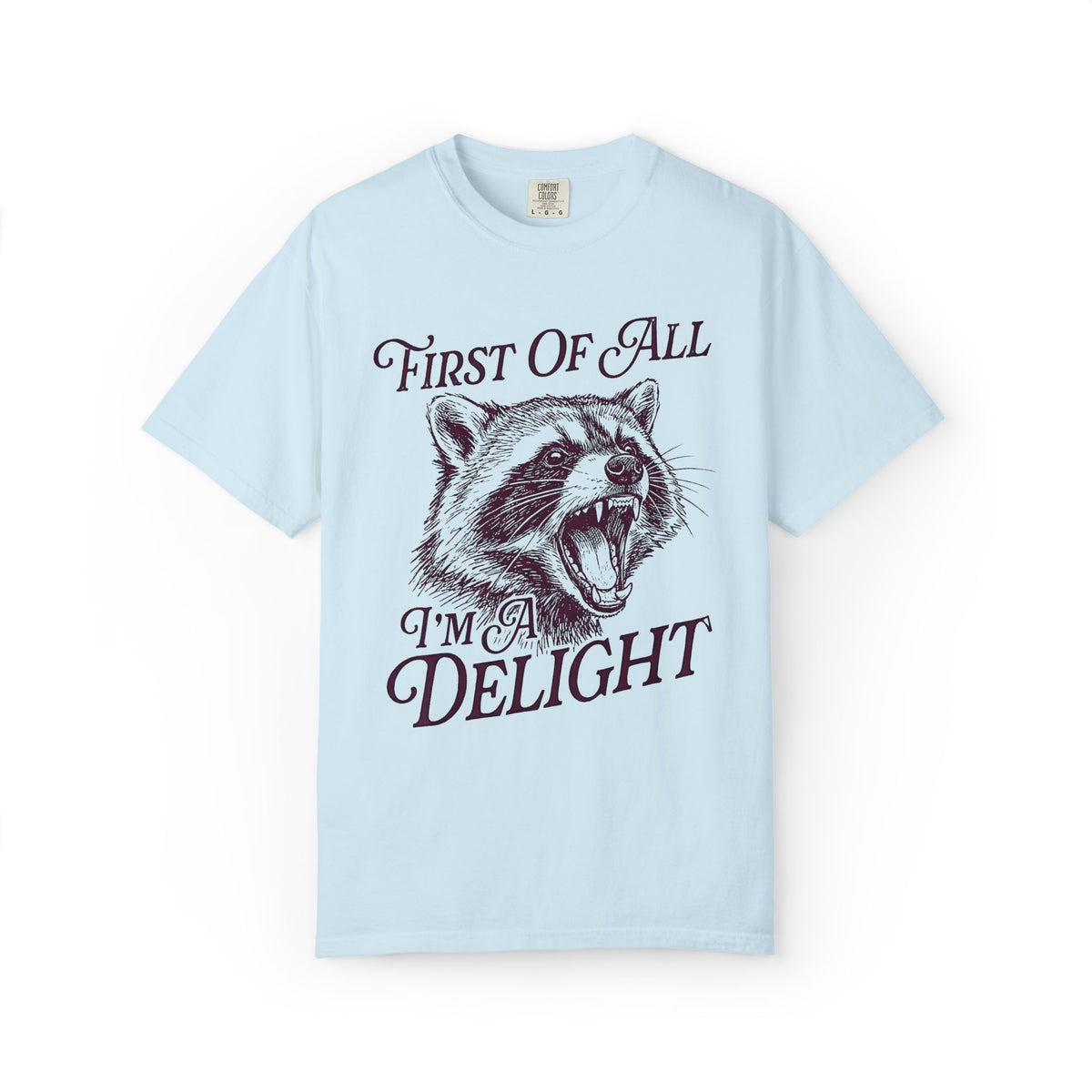 SEO Keywords: First Of All I'm A Delight T-Shirt, Funny Raccoon Shirt, Trash Panda Graphic Tee, Sarcastic Animal Shirt, Relatable Humor Apparel, Sassy Slogan Tee, Novelty Raccoon Gift, Hilarious Animal Meme Shirt.