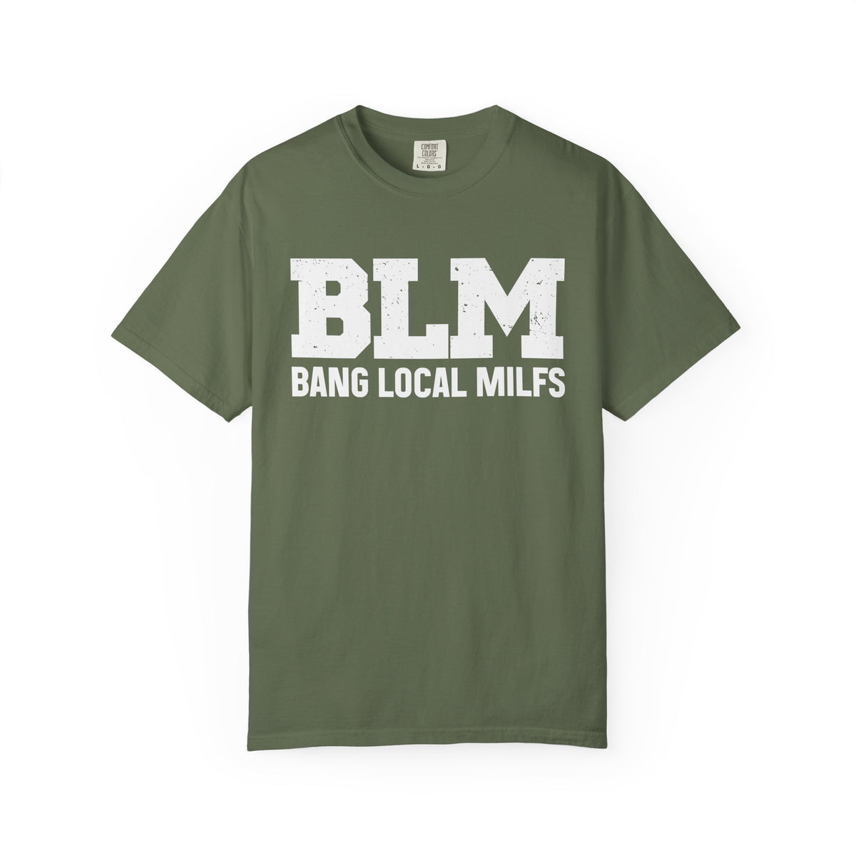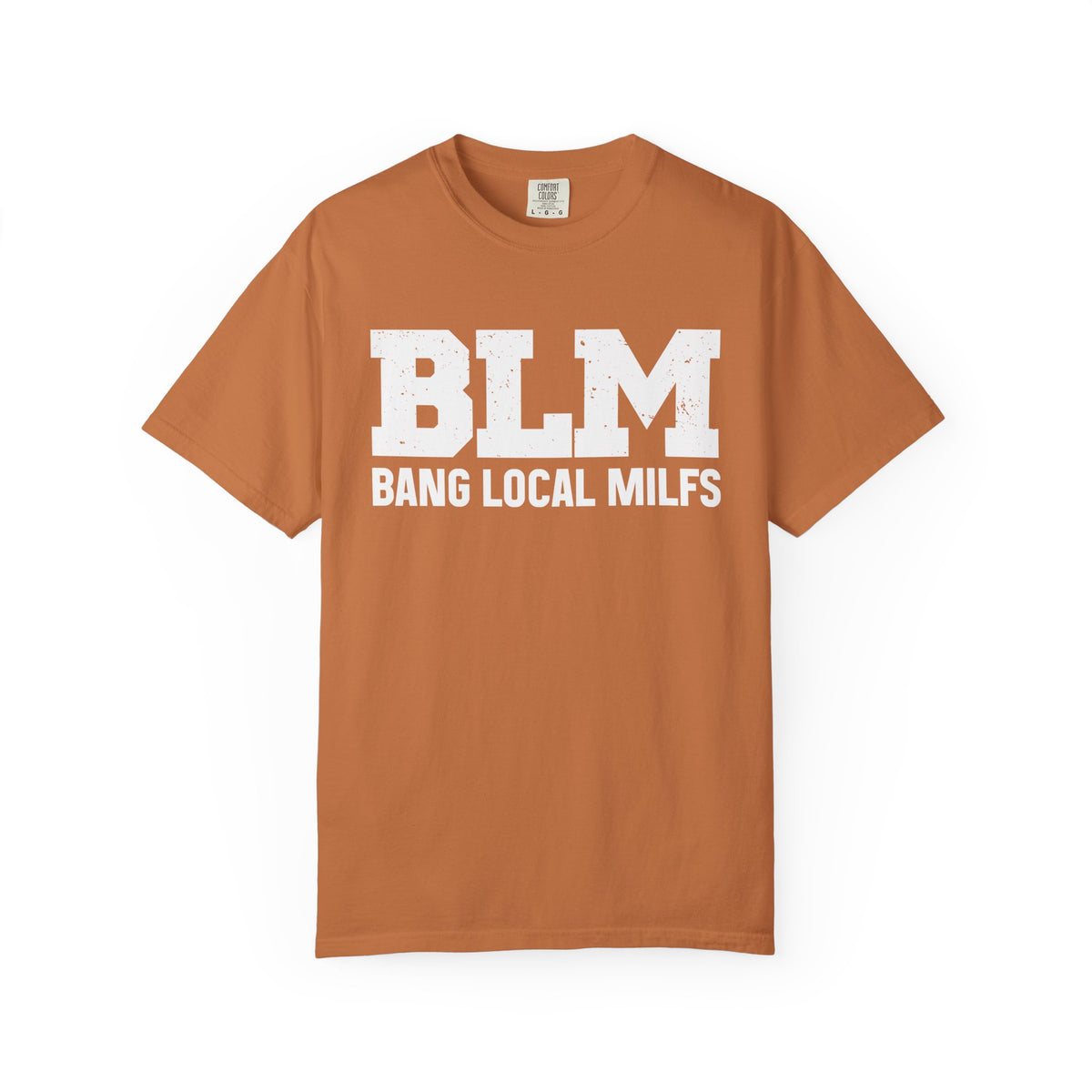 Make a bold, unapologetic statement with this highly offensive graphic tee. This shirt reclaims the "BLM" acronym to stand for "Bang Local MILFs," delivering maximum shock value and adult humor. Perfect for parties, bar nights, or anyone looking to push boundaries and get a reaction.