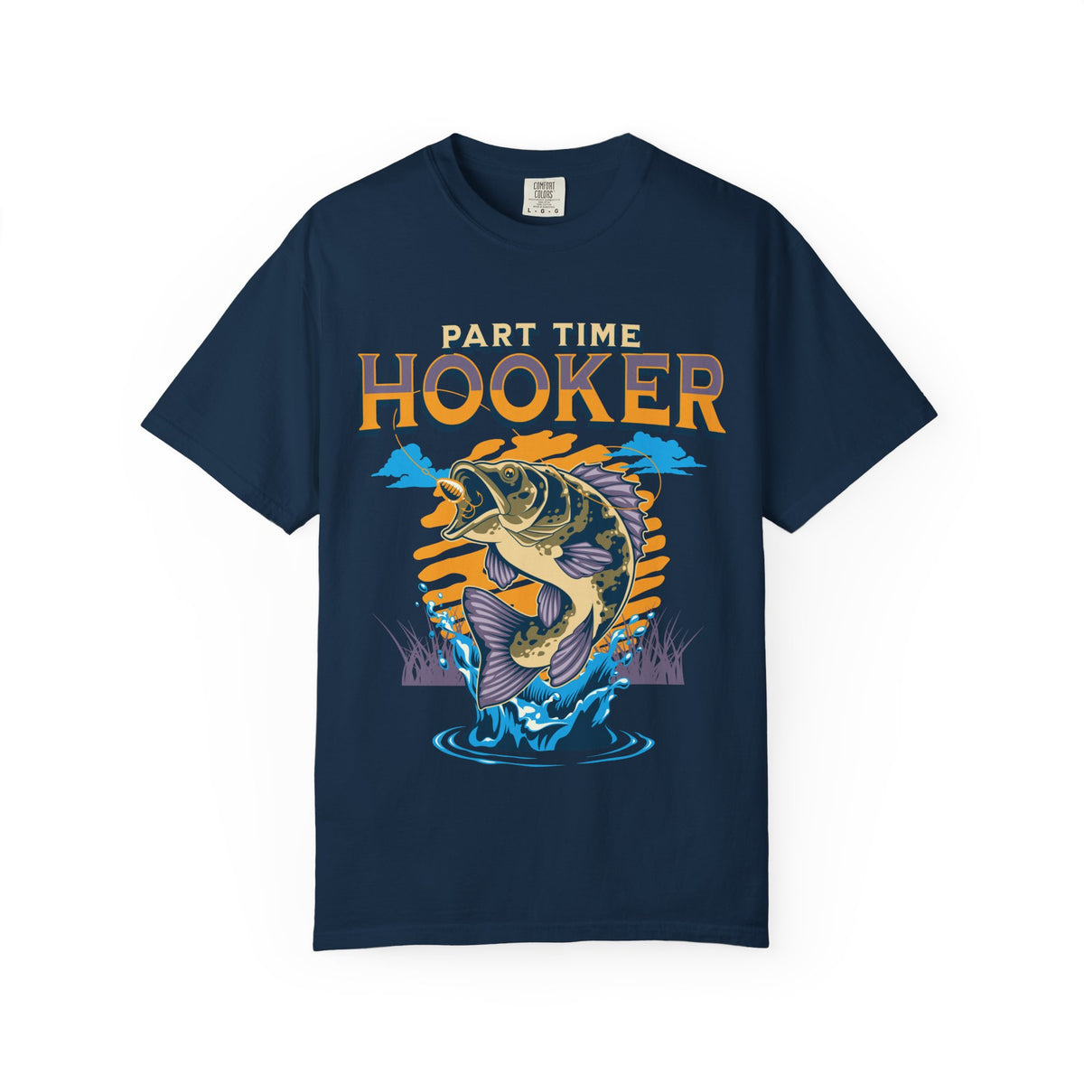 This Part Time Hooker Fishing T-shirt brings a grin to anyone who loves the water and a good laugh. The playful “Part Time Hooker” slogan reads like a fishing confession — worn by people who prefer the quiet tug of a line and the patient rhythm of casting. It feels lived-in from the start: soft garment-dyed cotton with a relaxed fit that sits comfortably after a long morning on the dock or an evening swapping stories by the boat.