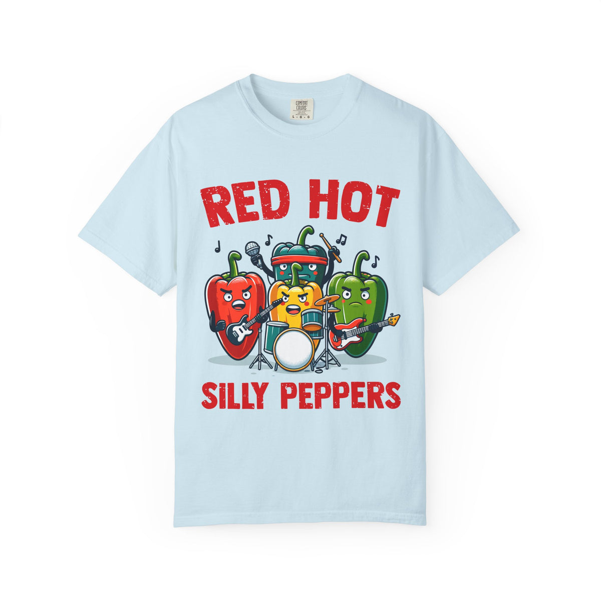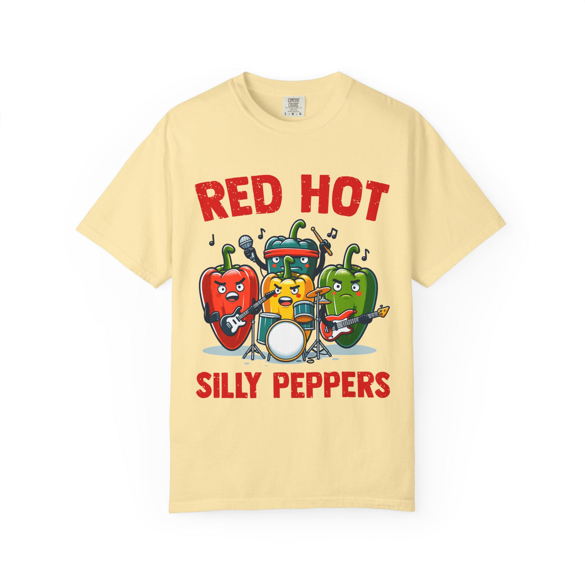 Turn up the heat and the humor with the hilarious "Red Hot Silly Peppers" T-Shirt! This funny graphic tee features a band of anthropomorphic peppers—a drummer, guitarist, and vocalist—rocking out, cleverly parodying the famous rock band. This shirt is a perfect blend of music humor and quirky food puns, guaranteed to make fans of both music and silliness smile.