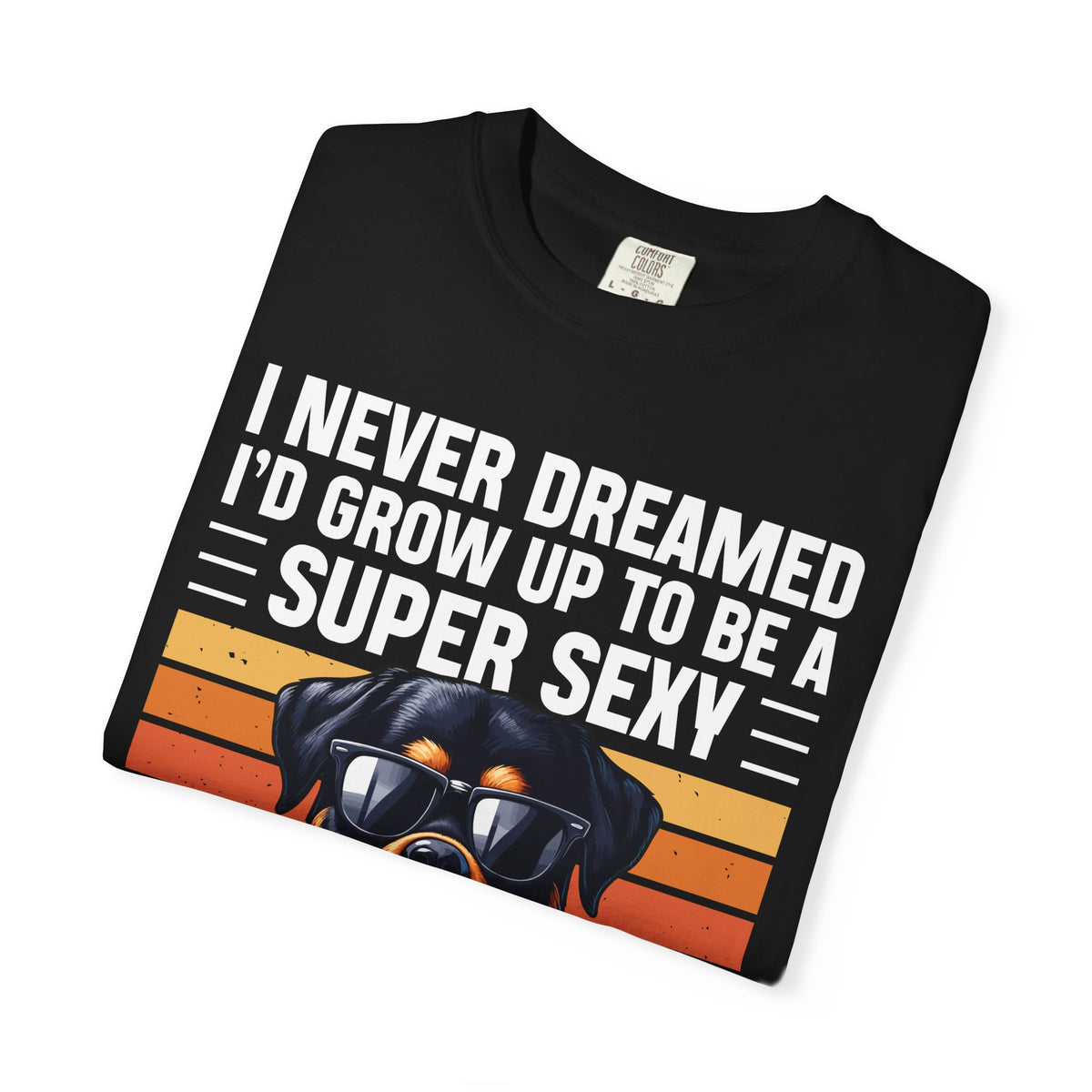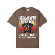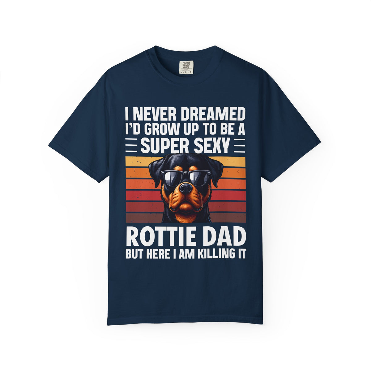 This Super Sexy Rottie Dad T-Shirt is perfect for any Rottweiler dad who wants to show off their love for their furry friend. With a relaxed fit and comfortable 100% ring-spun US cotton fabric, this tee is great for everyday wear. It gives off a fun and playful vibe, making it an ideal gift for Rottweiler lovers on Father's Day or birthdays.
